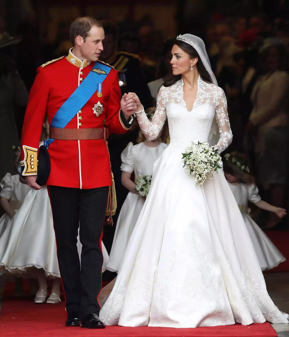 2011 年,凯特 · 米德尔顿身着莎拉 · 伯顿为亚历山大 · 麦昆品牌设计的定制婚纱,与威廉王子完婚。这款象牙色礼服裙采用了维多利亚风格的蕾丝束腰与 V 形领口设计,裙摆在臀部处进行了特殊填充,以呈现出如同绽放花朵般的形态,其身后则是长达近 9 英尺的拖尾。