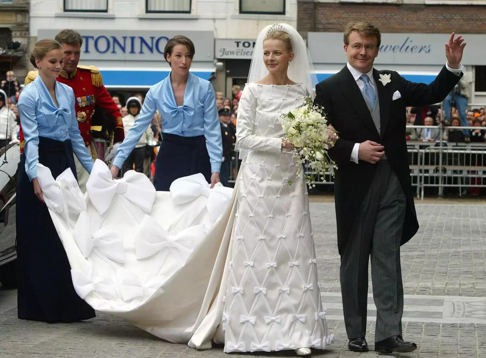 玛贝尔 · 范奥兰治公主为婚礼特别委托维克多与罗尔夫品牌设计了独一无二的船型领礼服,饰以乔其纱丝绸蝴蝶结,其中最大的蝴蝶结点缀在近 10 英尺长的拖尾末端。据《卫报》报道,设计师耗时 600 小时赶制完成这件礼服,供这位王室成员与已故丈夫约翰 · 弗里索亲王交换誓言——后者不幸于 2013 年因滑雪事故并发症去世。