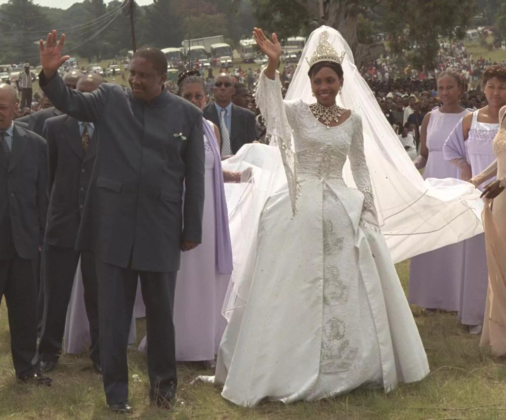原名安娜 · 卡拉博的莱索托王后玛塞内特 · 莫哈托 · 西索,2000 年身着长袖婚纱与莱西三世国王成婚时气度非凡。其多层开衩裙摆甚至饰有珠绣皇冠图案,上身的蕾丝束胸衣自然下垂,与镶满珠宝的腰封完美接续。