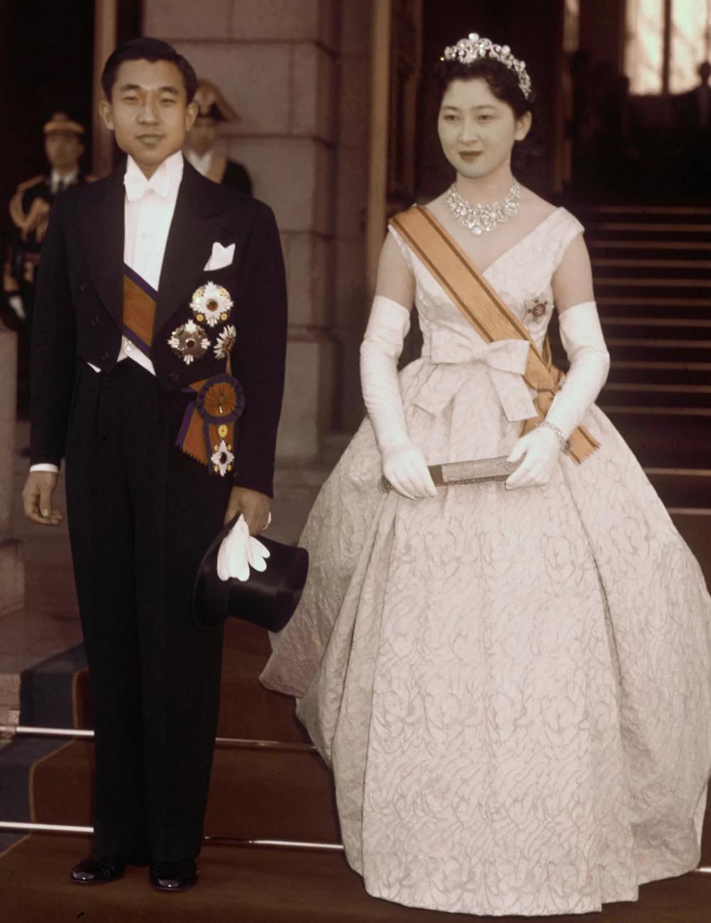1959 年,年轻的正田美智子成为首位嫁入日本皇室的平民,她与皇太子明仁的婚礼令世人瞩目。她身着以腰间大蝴蝶结为亮点的礼服,搭配宝冠章的黄色绶带及多件华贵珠宝,其中包括新太子妃佩戴的硕大钻石卷轴冠冕。