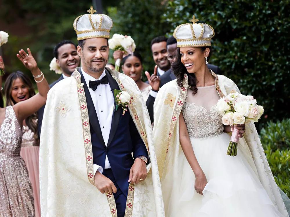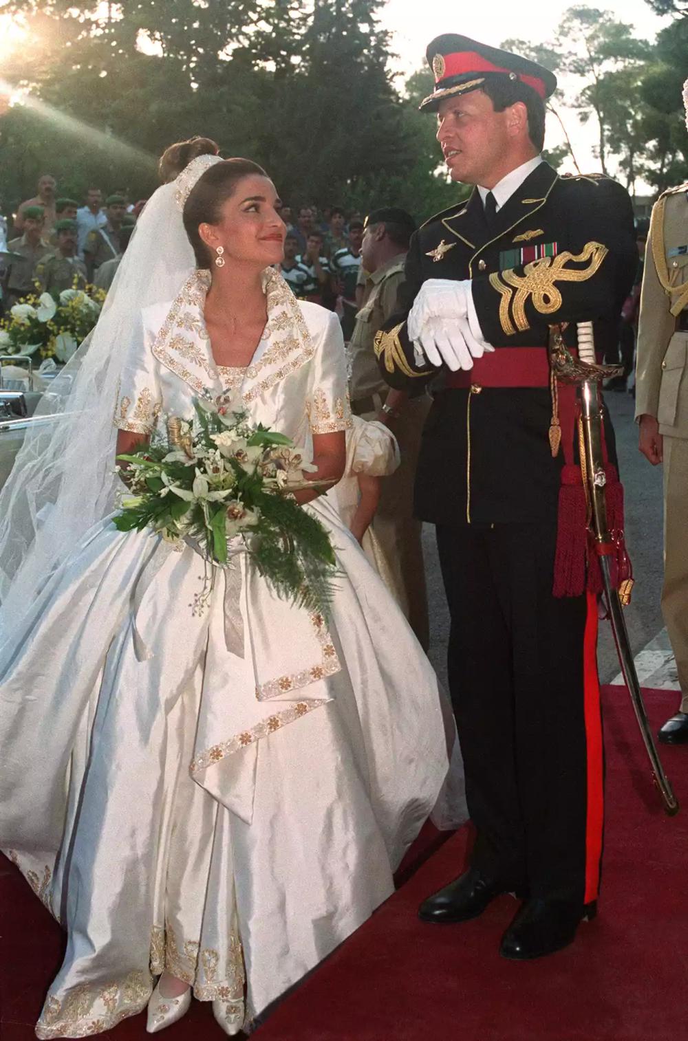 1993 年,约旦国王阿卜杜拉二世与约旦王后拉尼娅在扎赫兰宫举行婚礼时,新娘的婚纱出自布鲁斯 · 奥尔德菲尔德之手。据称这位英国设计师从伦敦维多利亚与阿尔伯特博物馆馆藏的叙利亚礼服中汲取灵感,最终打造出这款腰间系带的蓬松舞会礼服。其独特之处在于搭配了一件饰有精美金白双色珠饰的短外套——珠饰遍布领口、裙摆、衣领及七分袖。拉尼娅虽未佩戴王冠,却以闪亮发饰呼应礼服,并搭配面纱与及腕手套。
