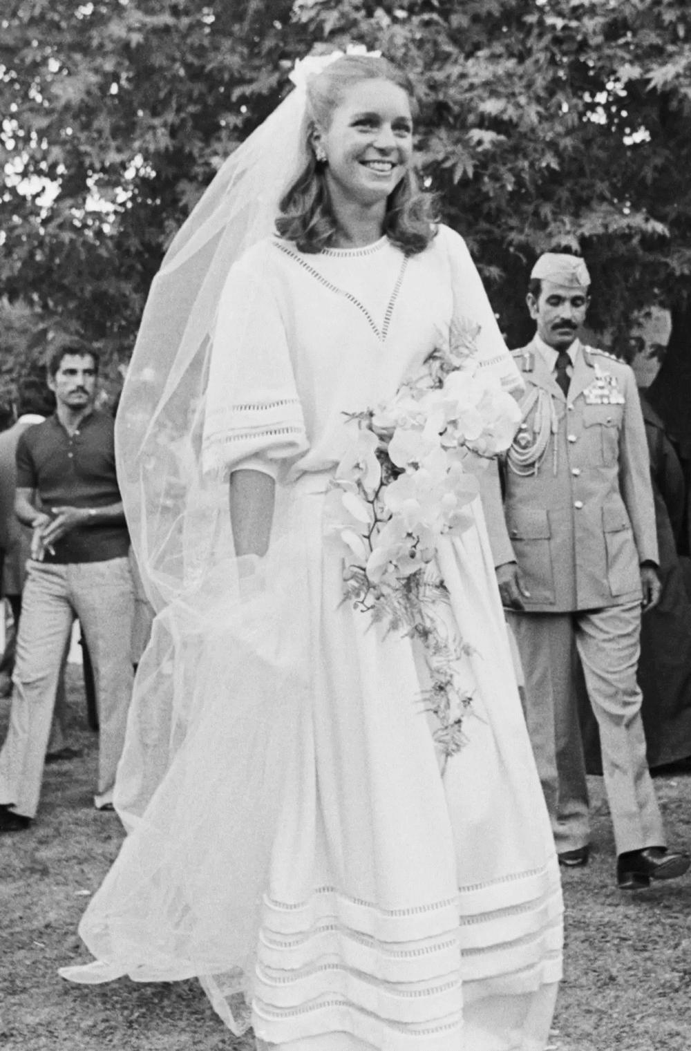 原名丽莎 · 哈拉比的约旦诺尔王后,于 1978 年与侯赛因国王成婚时身着迪奥波西米亚风格的白色丝绉礼服,并在婚后更名为努尔 · 侯赛因。礼服整体设计简约,但宽大的钟形袖与胸前、袖口及下摆的金色刺绣细节为整体造型增添了别样的趣味。