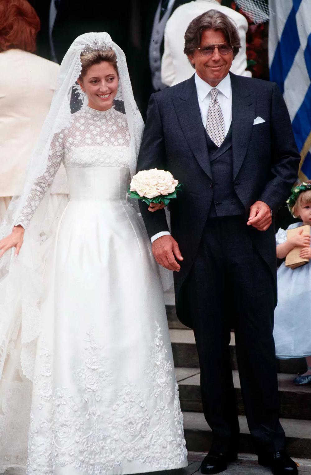 当玛丽 - 香塔尔 · 米勒与丈夫希腊王储帕夫洛斯交换誓言成为希腊王储妃时,唯有高级定制礼服方能彰显其身份。1995 年 7 月 1 日,这对新人步入婚姻殿堂,新娘身着华伦天奴礼服。高领蕾丝裙身饰以花卉图案,并镶嵌珍珠点缀,象牙色丝绸裙摆缀满玫瑰贴花。新娘身后垂落近 15 英尺长的面纱,头戴婆婆安妮 - 玛丽王后的古董胸花冠冕。