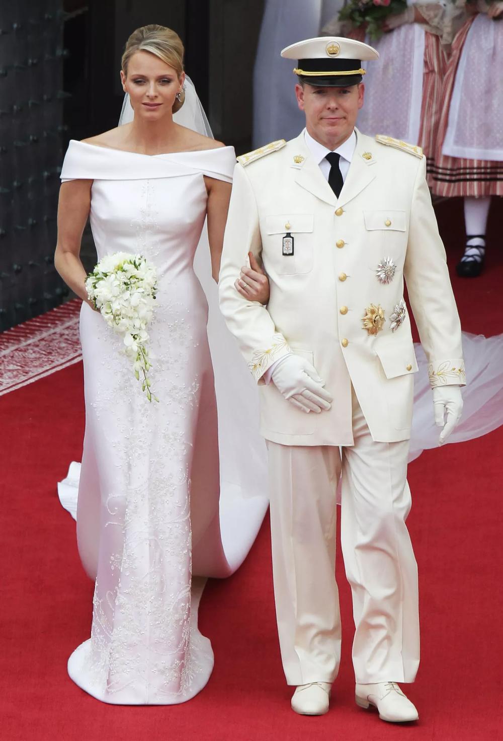 2011 年,摩纳哥夏琳公主身着象牙色乔治 · 阿玛尼礼服与阿尔贝二世亲王完婚,这件礼服凝聚了三位裁缝共计 2500 小时的心血。而裙身镶嵌的 40000 颗施华洛世奇水晶与 20000 颗珍珠母泪滴装饰,更彰显其非凡价值。