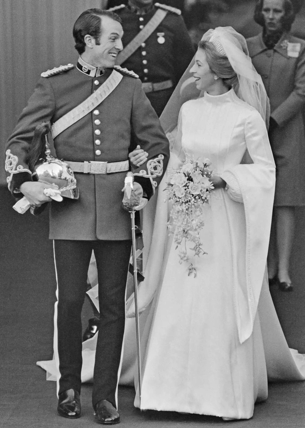 作为伊丽莎白二世女王与菲利普亲王之女,安妮公主在兄长查尔斯国王诞辰日迎娶了马克 · 菲利普斯上尉。在这场于威斯敏斯特教堂举行的盛大婚礼上,安妮身着莫琳 · 贝克设计的白色真丝雪纺礼服,立领与垂坠的喇叭袖成为设计亮点。丝质网纱面纱与玛丽王后流苏冠冕为整体造型画龙点睛。
