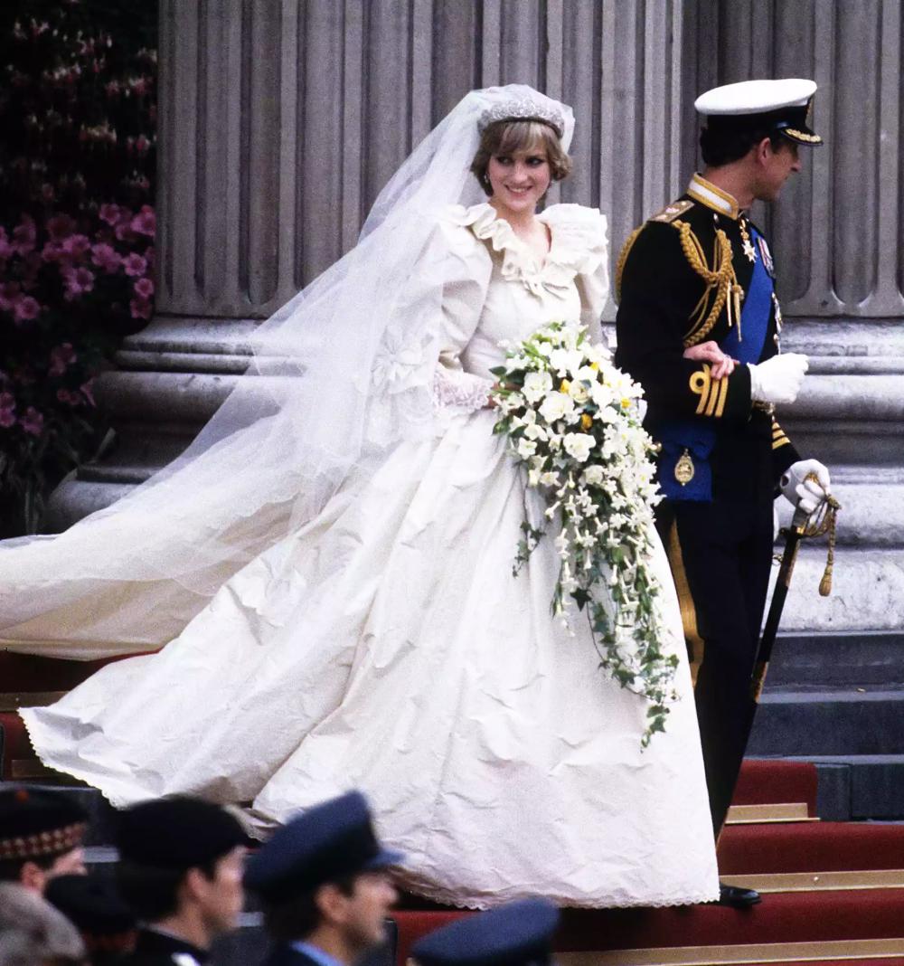 当戴安娜王妃于 1981 年与查尔斯三世国王成婚时,其婚纱礼服创下了多项历史纪录。她身着一件由伊丽莎白与大卫 · 伊曼纽尔设计的象牙色丝绸塔夫绸礼服步入圣保罗大教堂,礼服上饰有曾属于玛丽王后的古董蕾丝。其拖尾长达 25 英尺——这创下了英国王室新娘之最——由于体积庞大,它必须像折叠床单一样才能被塞进皇家马车。