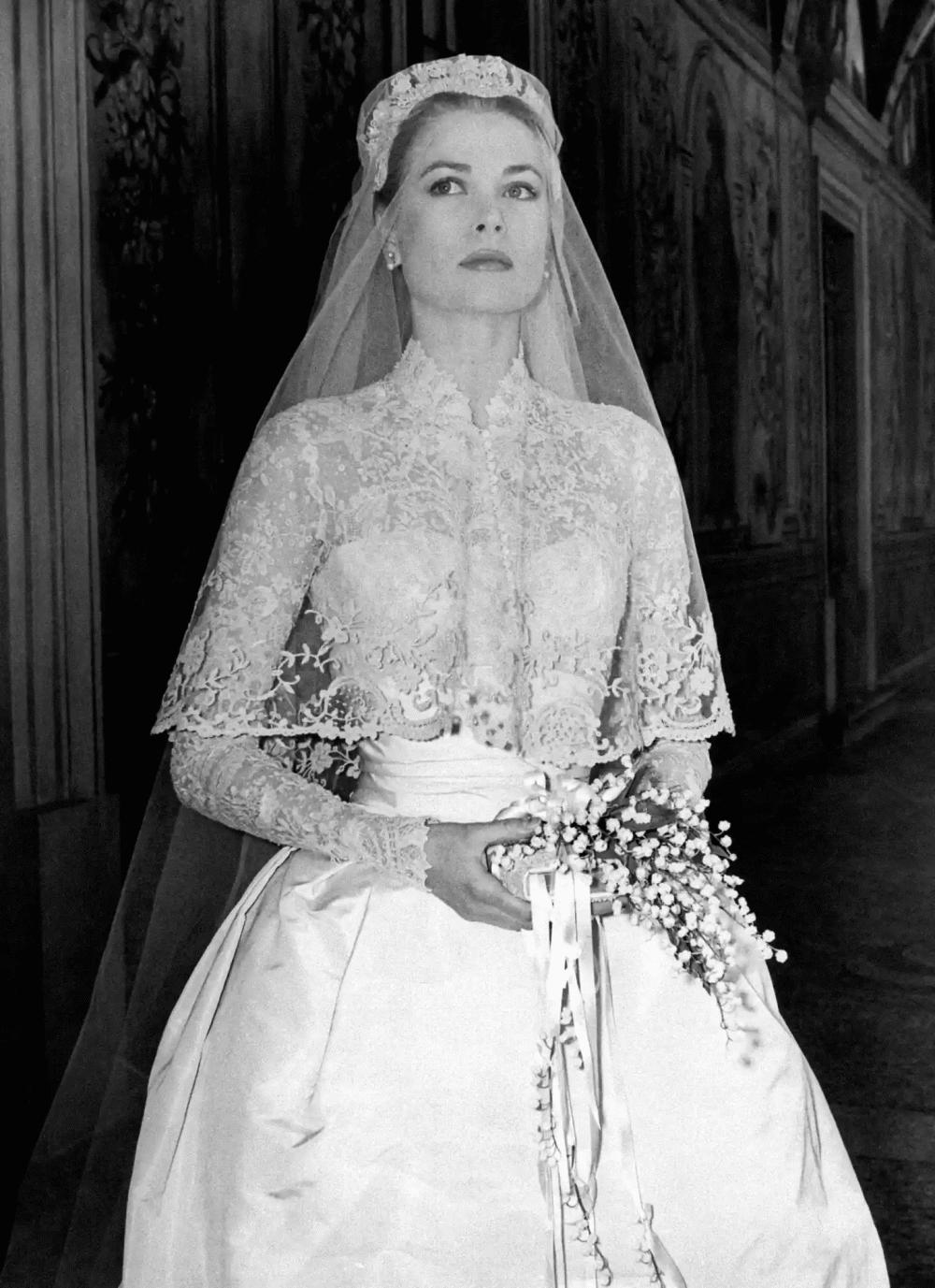 格蕾丝 · 凯利 1956 年的经典婚纱启发了凯特王妃乃至米兰达 · 可儿等众多后世新娘。这件由米高梅制片厂老板赠予的婚纱,在厂内工坊由凯利长期合作的服装设计师海伦 · 罗斯与 30 名裁缝手工缝制,耗费了 300 码古董比利时蕾丝、象牙色绉缎与丝绸网纱。
