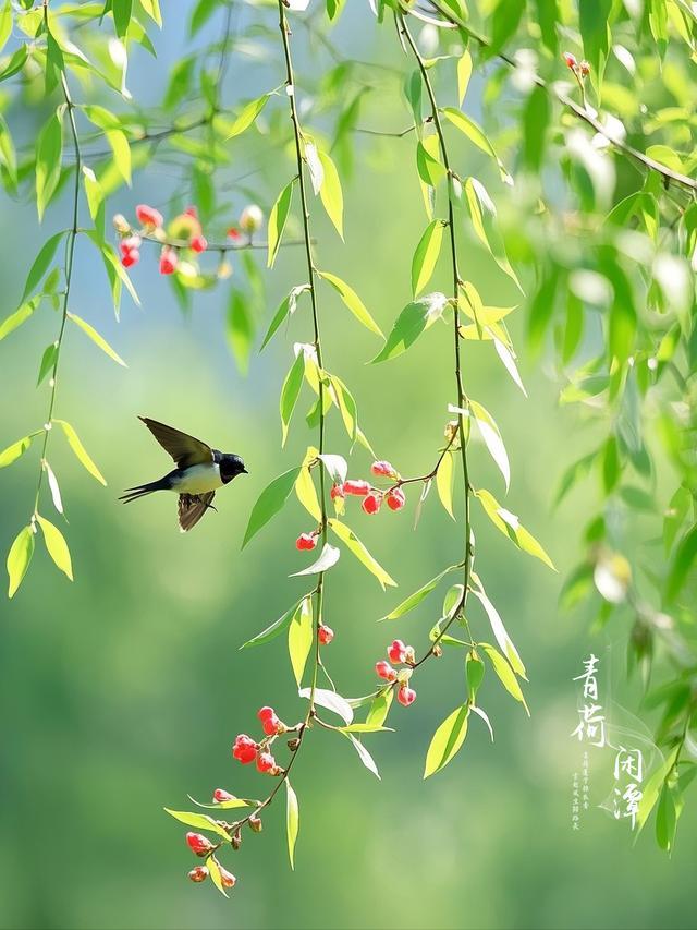 早春的花树枝头,已经冒出一点可见的红润,水面上的寒冰已经消融,春水在阳光下闪耀着粼粼的波光,新生的鸟儿在春风中翩翩起舞,叫声婉转动听。