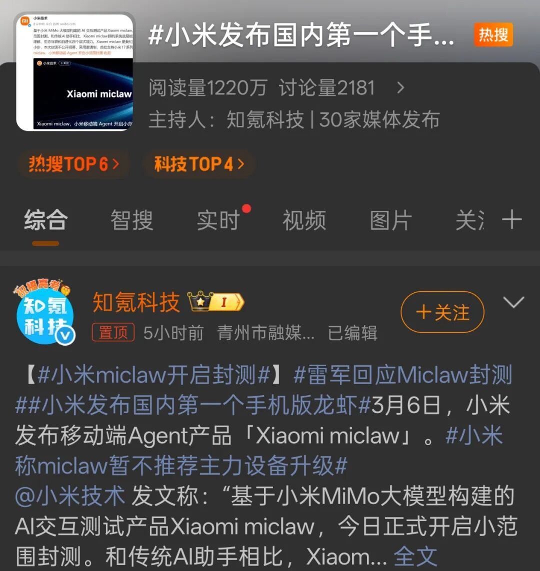 与此同时,小米发布了国内第一个手机版龙虾,直接打响了“手机厂商Agent潮”第一枪。