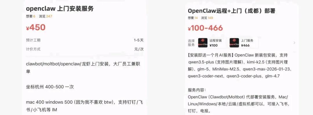 这并非个例。在小红书、闲鱼等平台,“OpenClaw上门安装”已成为热门搜索词,价格从300元到1000元不等,甚至有商家打出“全女工程师团队,1200元/次”的招牌。