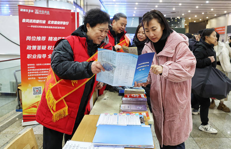 火车站为何会有就业向导?北京青年报记者了解到,这是由市人社局联合市重点站区管委会首次举办的“春风送岗暖归途 北京就业伴你行”公共就业服务宣传系列活动。活动聚焦春节前后离京、返京高峰期,将就业服务直接送到机场、火车站。东城、西城、朝阳、海淀、丰台、通州、顺义、大兴等8区人社部门联动出击,职业指导师等专业力量共同进驻,在北京站、北京西站、北京朝阳站、北京丰台站等八大火车站以及首都、大兴两座机场,同步设立流动宣传站点,把招聘信息、技能培训、职业规划和权益保障等“一站式”服务,直接送到劳动者的归乡起点和返京第一站。