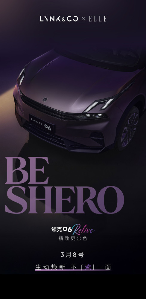 而领克06 Relive紫色车色将于3月8日上线。该配色与“世界时装之苑ELLE”共创,以“SHERO”为主题,打出了“精致更出色”的口号,意在致敬那些不被定义、拥有多元魅力的女性用户。海报中“生动焕新不‘紫’一面”的标语,更暗示新车色旨在彰显车主不止一面的个性风采。据悉,2026款领克06 Relive目前共有Max与Ultra两款配置,指导价区间为11.76万至12.96万元。